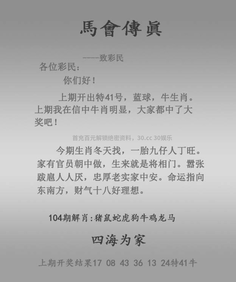 103期:男女②肖【男肖+蛇猪】开:牛41准 |